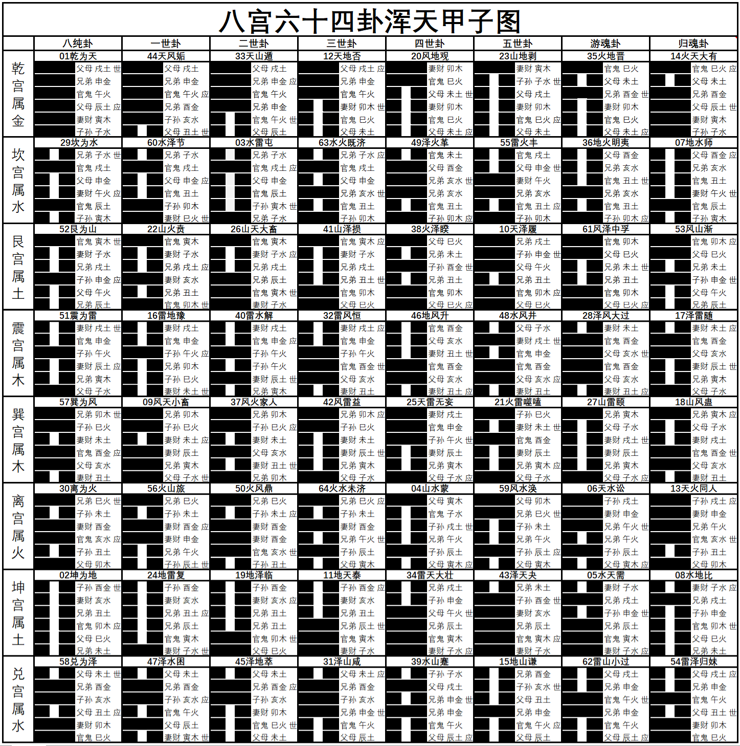 纳甲分内外卦,从下往上装,先装内卦,再装外卦,内卦天干相同,外卦天干相同,奇数位顺装(例:甲子、甲寅、甲辰),偶数位逆装(例:乙丑、乙亥、乙酉)。只有乾坤两卦内外卦天干不同,其它都相同;内卦和外卦的对应爻的地支都两两相冲(八纯卦中),附: