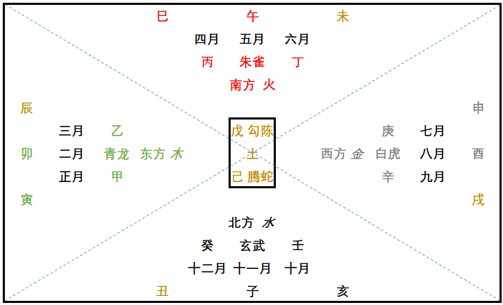 | 上爻 | 玄武 | 青龙 | 朱雀 | 勾陈 | 腾蛇 | 白虎 |