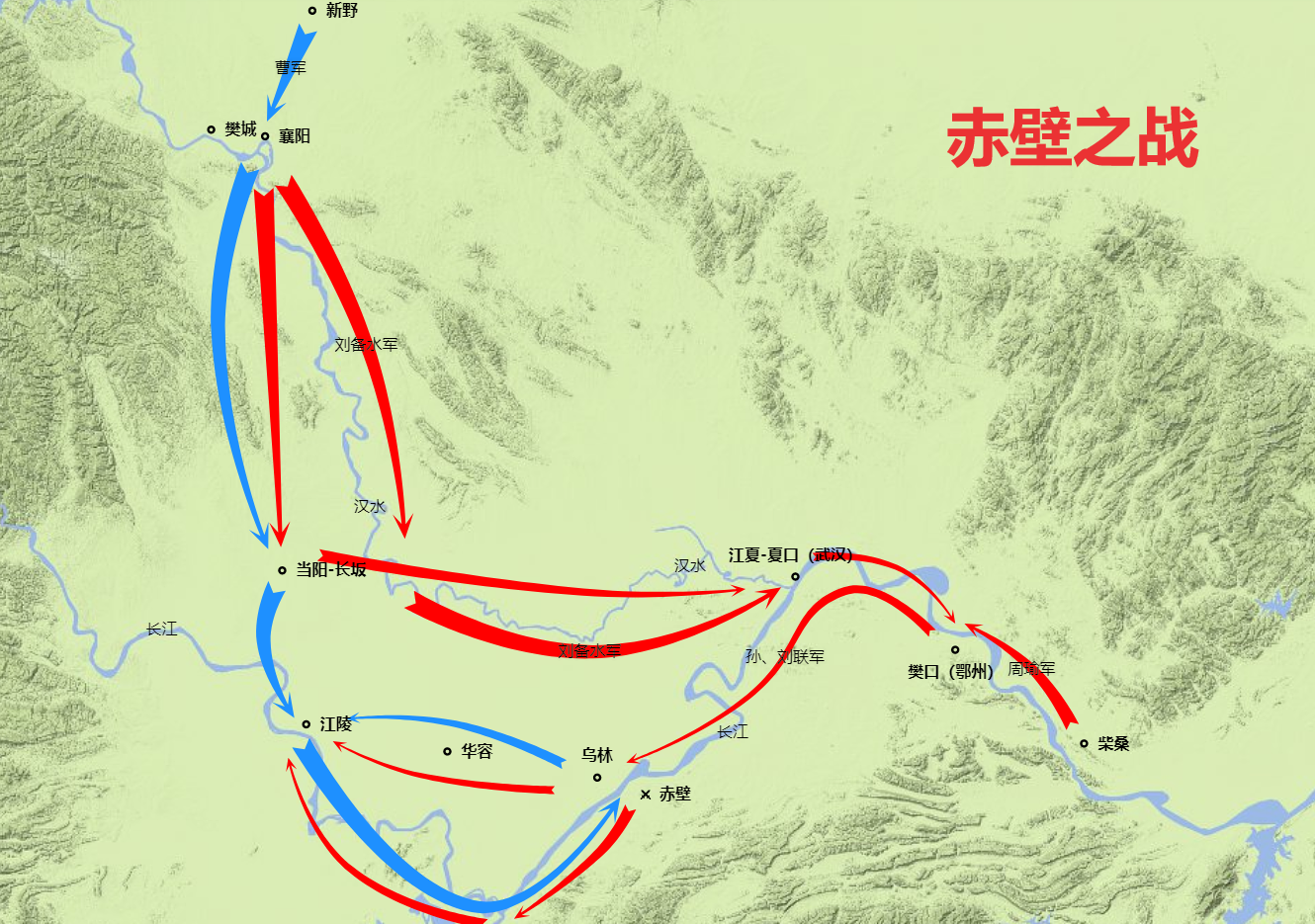 周瑜帅轻锐(兵人10)追击,曹操败走华容道(兵人50-10),留下曹仁守江陵(兵人10),乐进守襄阳(兵人10),引军北还。
